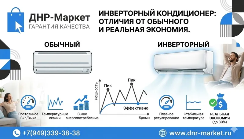 Инверторный кондиционер: Работает как современный автомобиль на "круиз-контроле". Он плавно разгоняется до 60 км/ч и затем слегка поддерживает обороты двигателя, чтобы ехать ровно, плавно и без рывков. Никаких лишних нагрузок и идеальная тишина.