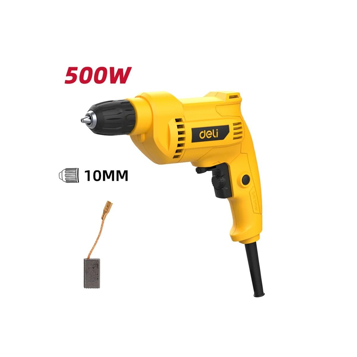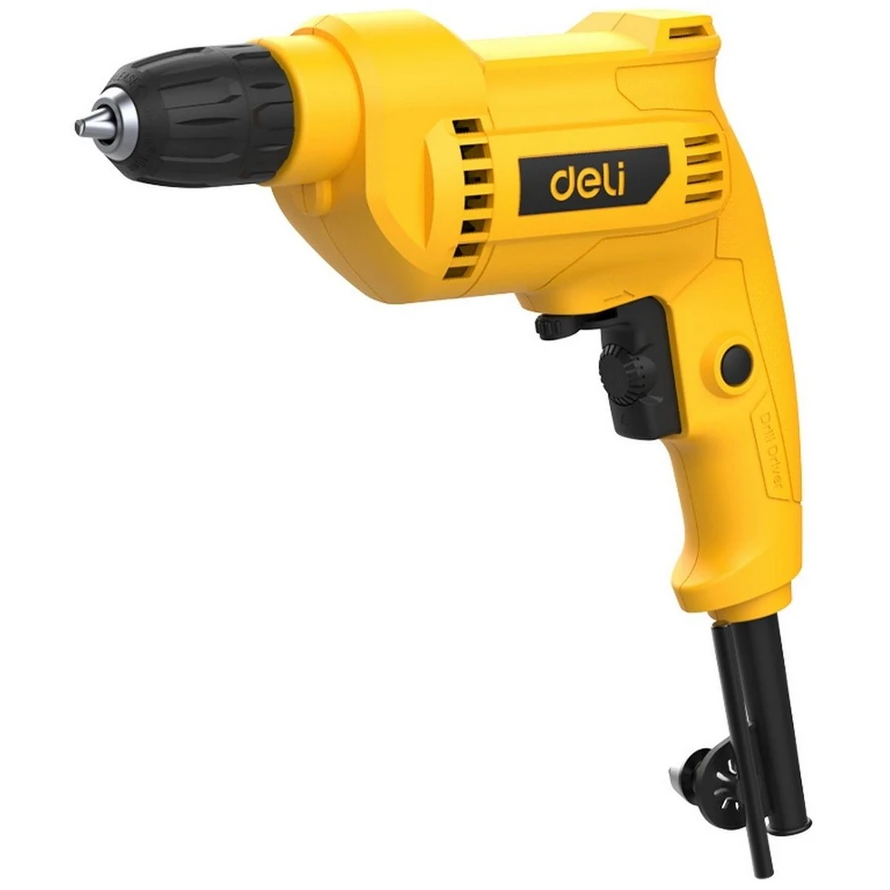 Deli DL-DZ10-E2 — мощная и удобная сетевая дрель для любых задач!Двигатель 500 Вт и скорость до 3300 об/мин позволяют легко сверлить дерево, металл и пластик, а продуманная конструкция делает работу комфортной даже при интенсивном использовании.