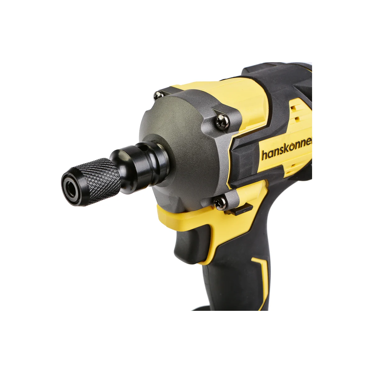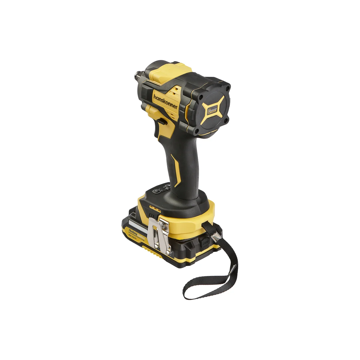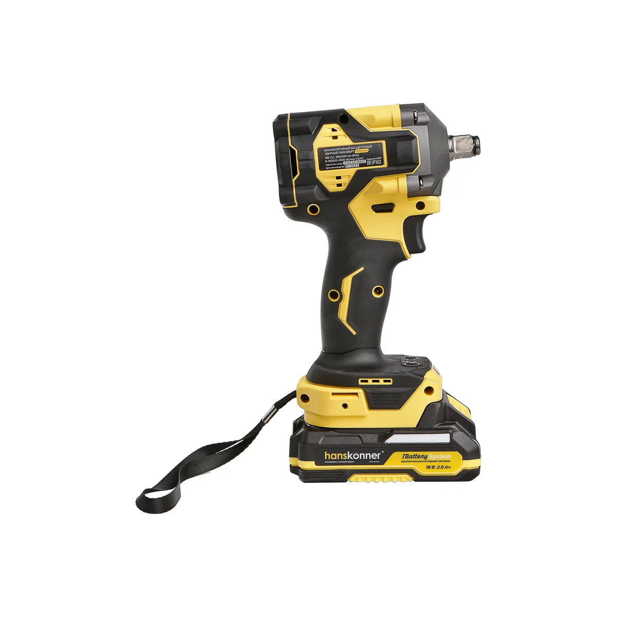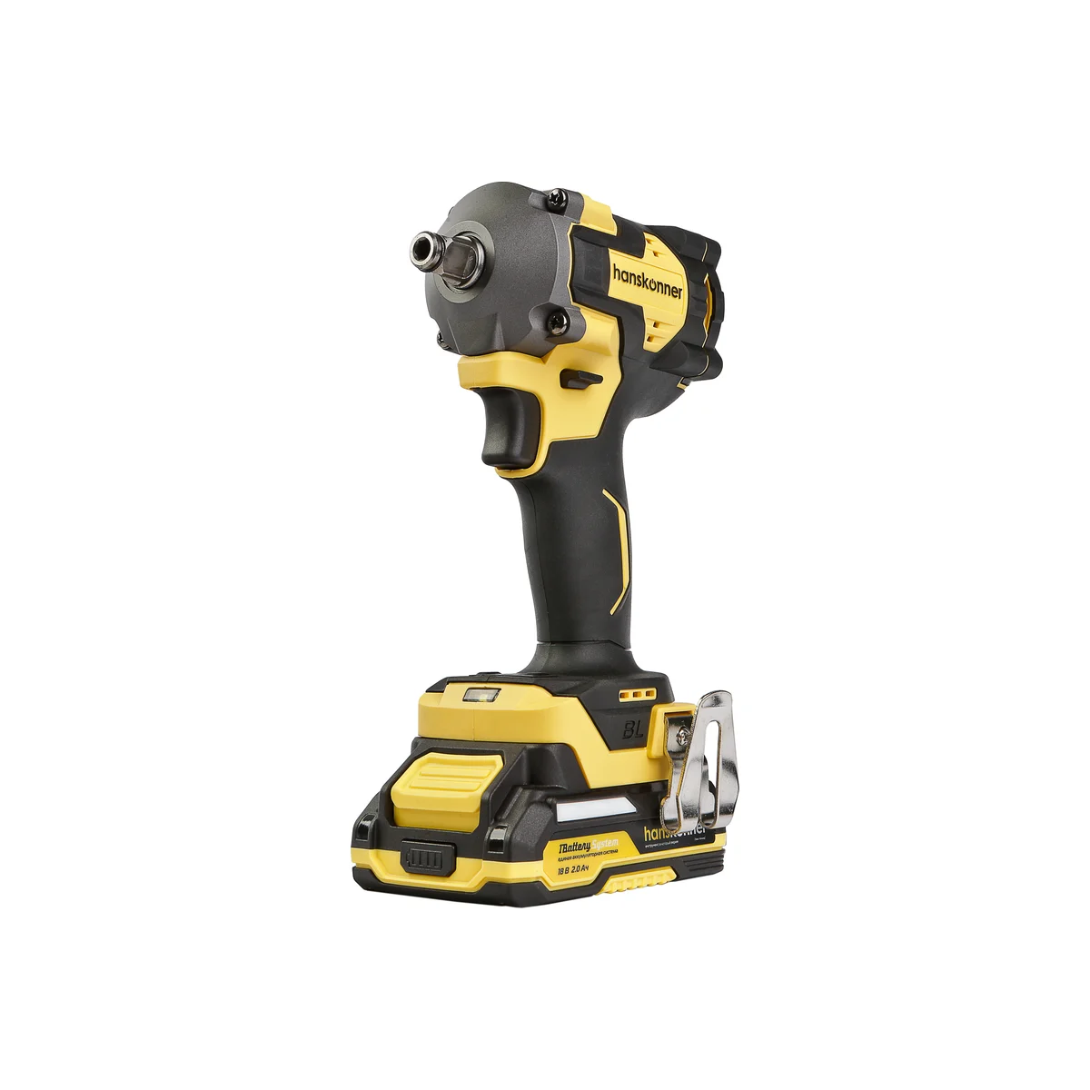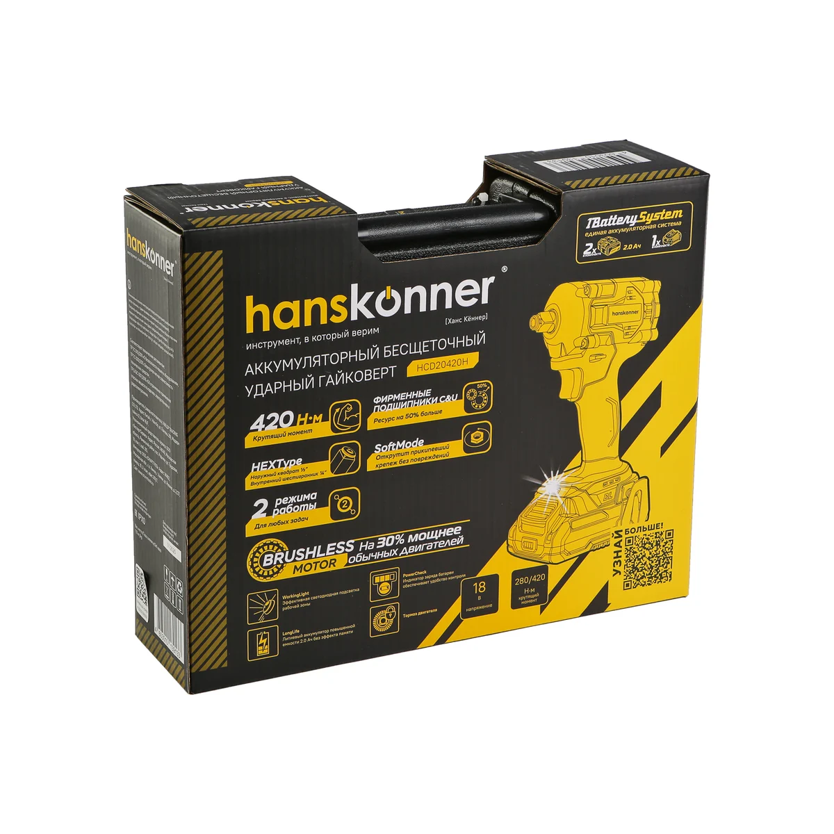 Hanskonner HCD20420H – аккумуляторный 18В, ударный гайковерт с наружным квадратом 1/2″ и возможностью установки оснастки под шестигранник 1/4″ – является частью системы 1BatterySystem, обеспечивающей совместимость одного и того же аккумулятора с целым рядом наименований инструмента.