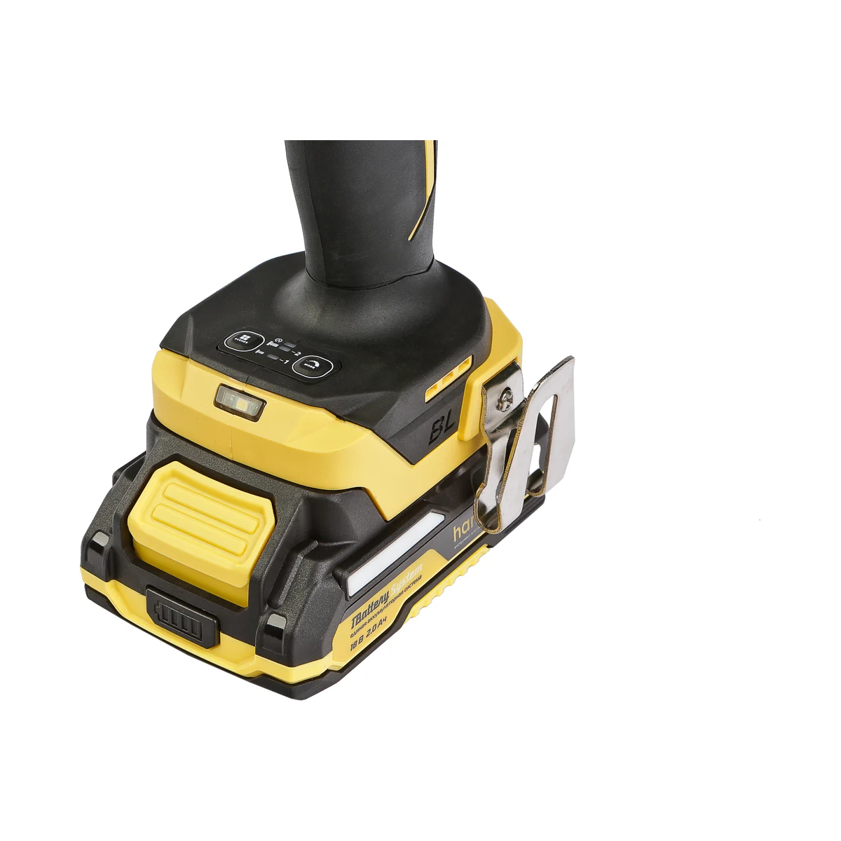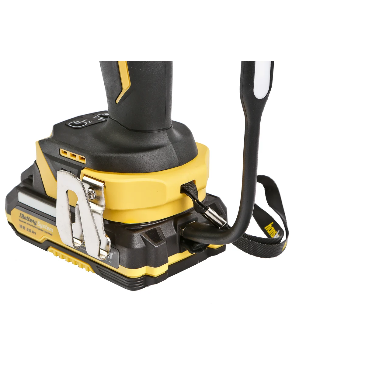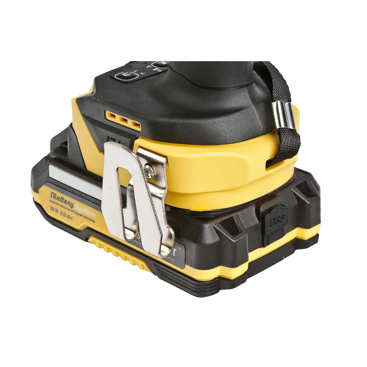 - Гайковерт штатно комплектуется двумя литий-ионными (Li-ion) аккумуляторами емкостью 20 А ч с возможностью подзарядки от него через USB выход сторонних гаджетов, импульсным зарядным устройством, USB LED-фонарем, запитываемым от АКБ