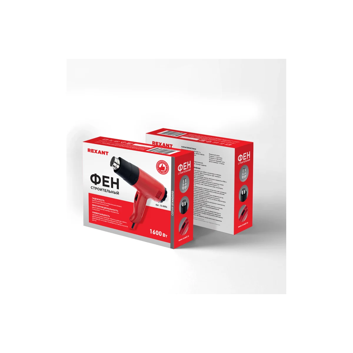 Технические характеристики REXANT 12-0054Мощность1500 ВтРабочая температура180/500 °СТиппистолетныйРежим холодной продувкинетРегулировка температурыступенчатаяРасход воздуха450 л/минКоличество насадок в наборе1ЖК-дисплейнетMin рабочая температура180 °СВид упаковкикоробка