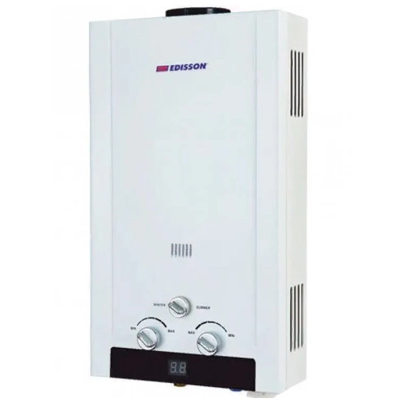 EDISSON Эдисон H 20 DL газовая колонка современного образца, работающая на сжиженном баллонном газе. Модель отличается надежностью и практичностью, в арсенале функций предусмотрен режим ЗимаЛето. Датчик протока воды отключает подачу газа при недостаточном давлении. Розжиг горелки электронный. Особенности рассматриваемой модели газовой колонки серии EDISSON HEAT: Лужёный теплообменник весом 1,9 кг Регулировка протока водыподачи газа Электронный розжиг горелки Многоступенчатая система защиты Переключатель режимов зималето Узкий корпус Надежный водогазовый узел Проточные водонагреватели, работающие от сети магистрального газа самый экономичный и доступный тип оборудования для создания системы ГВС в доме или квартире. Модели серии HEAT от торговой марки EDISSON характеризуются надежностью и практичностью в использовании, благодаря наличию многоступенчатой системы защиты. Модели выполнены в плоском настенном корпусе.