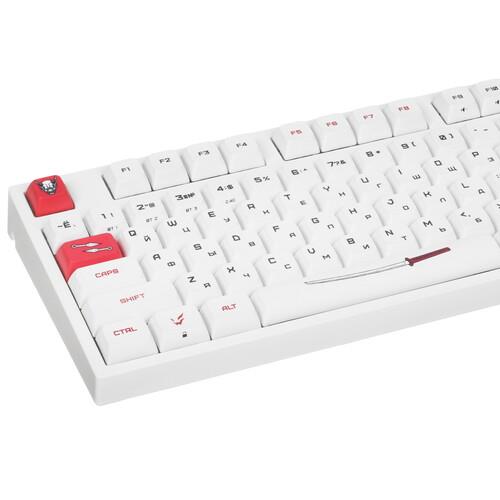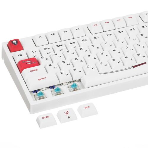 Клавиатура ARDOR GAMING Katana [AG-ZD-104GT-XDA-HS-W] выполнена в белом корпусе с красными клавишами и рисунками в самурайском стиле. Она разработана для точного и комфортного управления в играх. Механические переключатели Gateron Mint с укороченным ходом 2 мм и ресурсом 80 млн нажатий обеспечивают быструю реакцию. Благодаря смазанным стабилизаторам каждое нажатие выполняется легко и плавно.