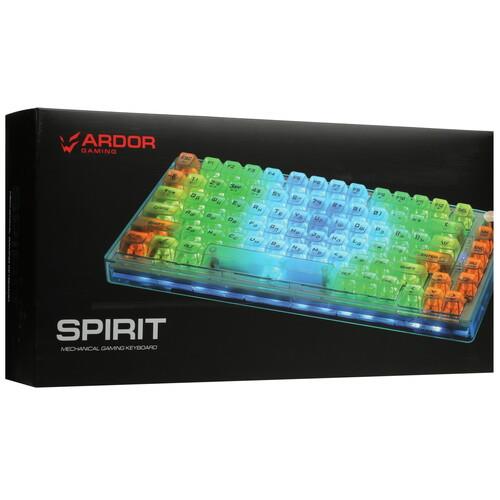 ARDOR GAMING Spirit оснащена 82 клавишами, среди которых есть ряд Fn и отдельный цифровой блок. Яркая RGB-подсветка выполняет функцию декора и сохраняет точность управления при плохом освещении в комнате. Клавиатура с поддержкой Hot Swap позволяет быстро менять переключатели без пайки.