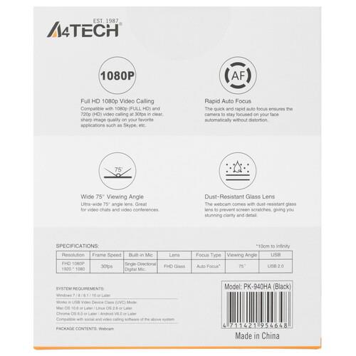 Камера A4Tech PK-940HA обладает системой автоматической фокусировки. Разрешение видео – 1920x1080. Максимальная частота кадров – 30 кадров в секунду. Качество «картинки», обеспечиваемое устройством, более чем достаточно для интернет-общения. Угол обзора камеры – 75°. Необходимое качество записи звука гарантирует интегрированный цифровой микрофон.