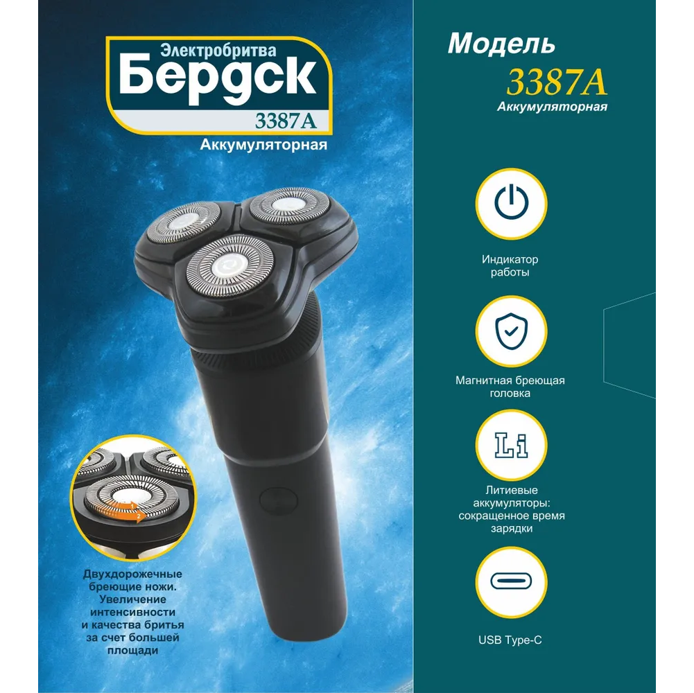 Электробритва "БЕРДСК" модель 3387А - электроприбор личной гигиены, предназначенный для сухого бритья. Прибор предназначен для использования в домашних условиях.