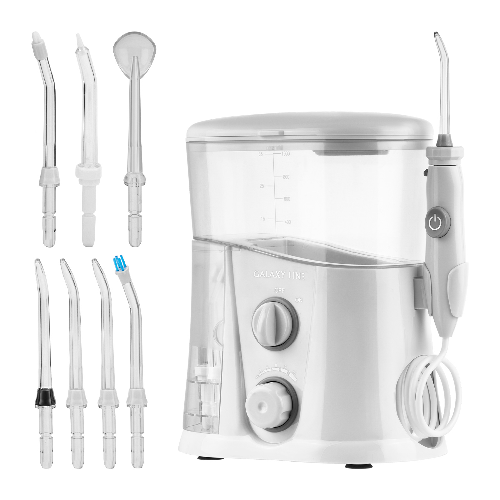 Съемный резервуар для воды, мл: 1000Регулятор потока: даКоличество насадок, шт: 7Вид насадки ирригатора:Стандартная насадка 3 штПародонтологическая насадкаОртодонтическая насадкаНасадка для чистки языкаНасадка для чистки зубного налета.Регулировка интенсивности потокаВлагозащита: IPX4Шланг 87 смМощность: 20 ВтДвойное напряжение 100 В - 240 В, 50 Гц / 60 ГцТаймер завершения чисткиМакс. частота пульсации 1800 импульсов в минутуМакс. давление струи 870 кПаВращение насадки на 360°Габаритные размеры прибора 20*10,3*21,5 смОтсек для хранения насадок
