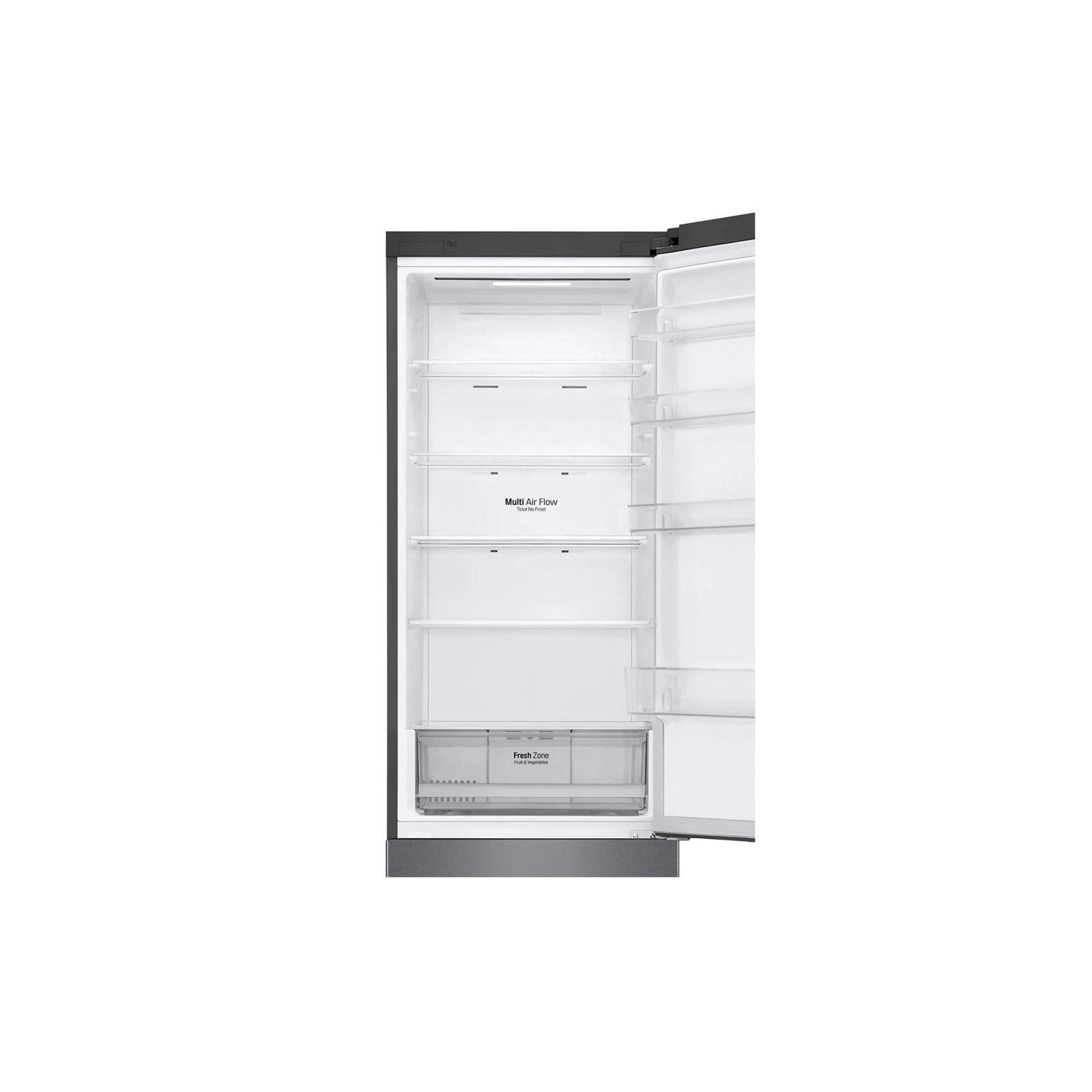 Конструкция петель обеспечивает открывание дверцы с нулевым зазором, поэтому распахивать ее на 90° и свободно выдвигать ящики можно, даже если прибор установлен вплотную к стене. Интуитивно понятное управление холодильником LG DoorCooling+ GA-B509CLWL, в том числе установка температуры в обеих камерах, выполняются при помощи сенсорной панели управления, размещенной на лицевой стороне дверцы.
