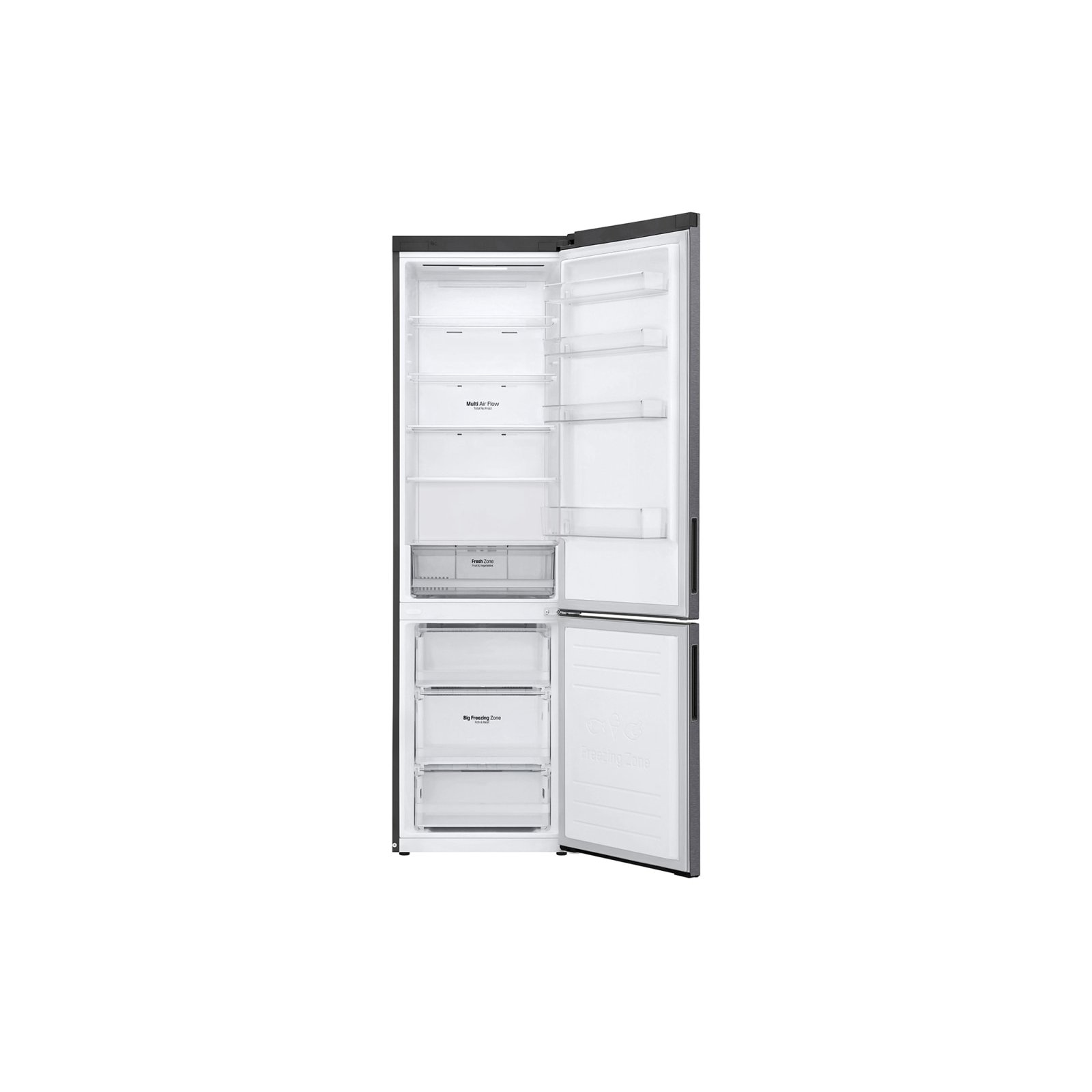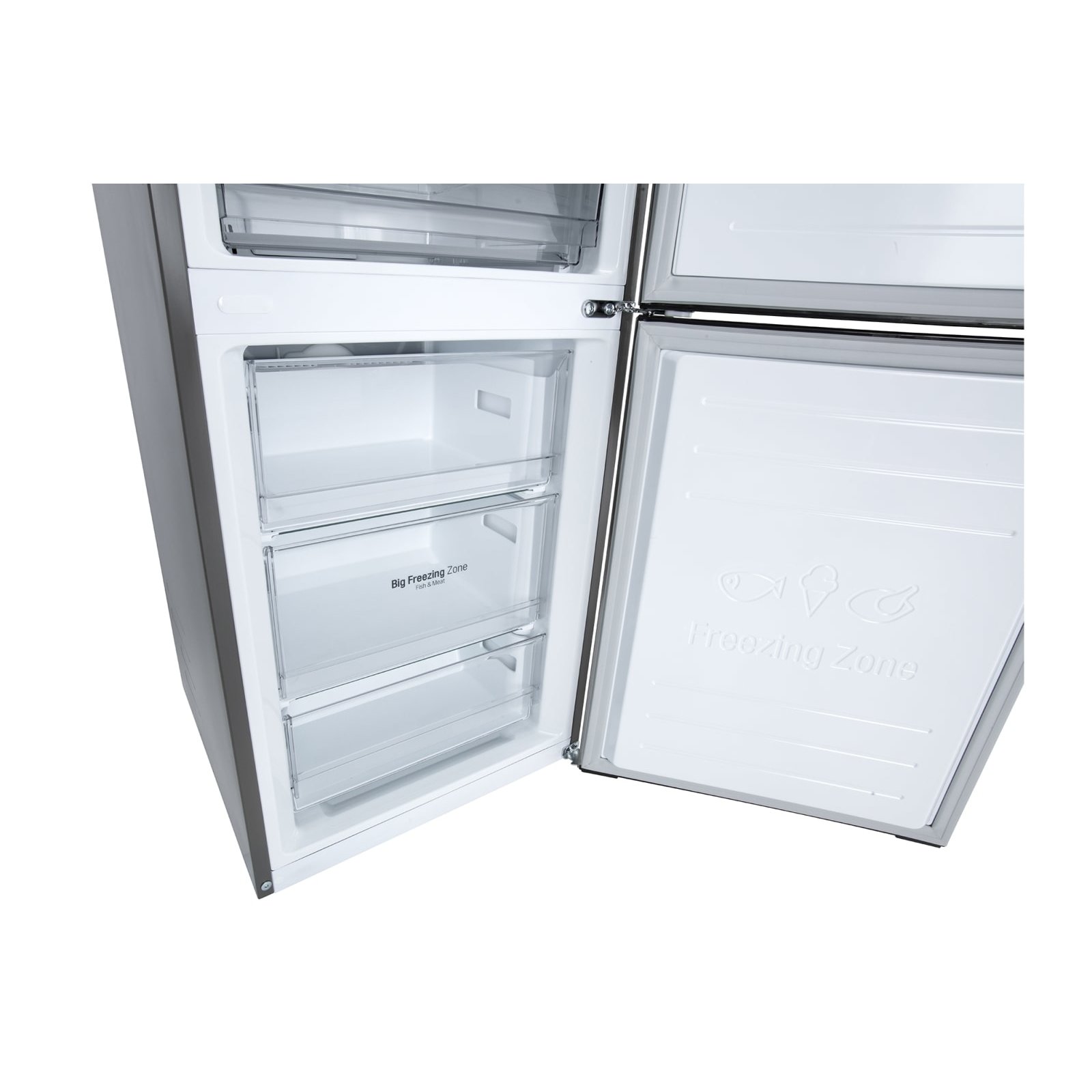 Морозильное отделение вместимостью 107 литров расположено внизу. Его замораживающая способность — 12 кг/сутки. Благодаря системе Total No Frost ни морозилка, ни холодильная камера не требуют периодической разморозки.