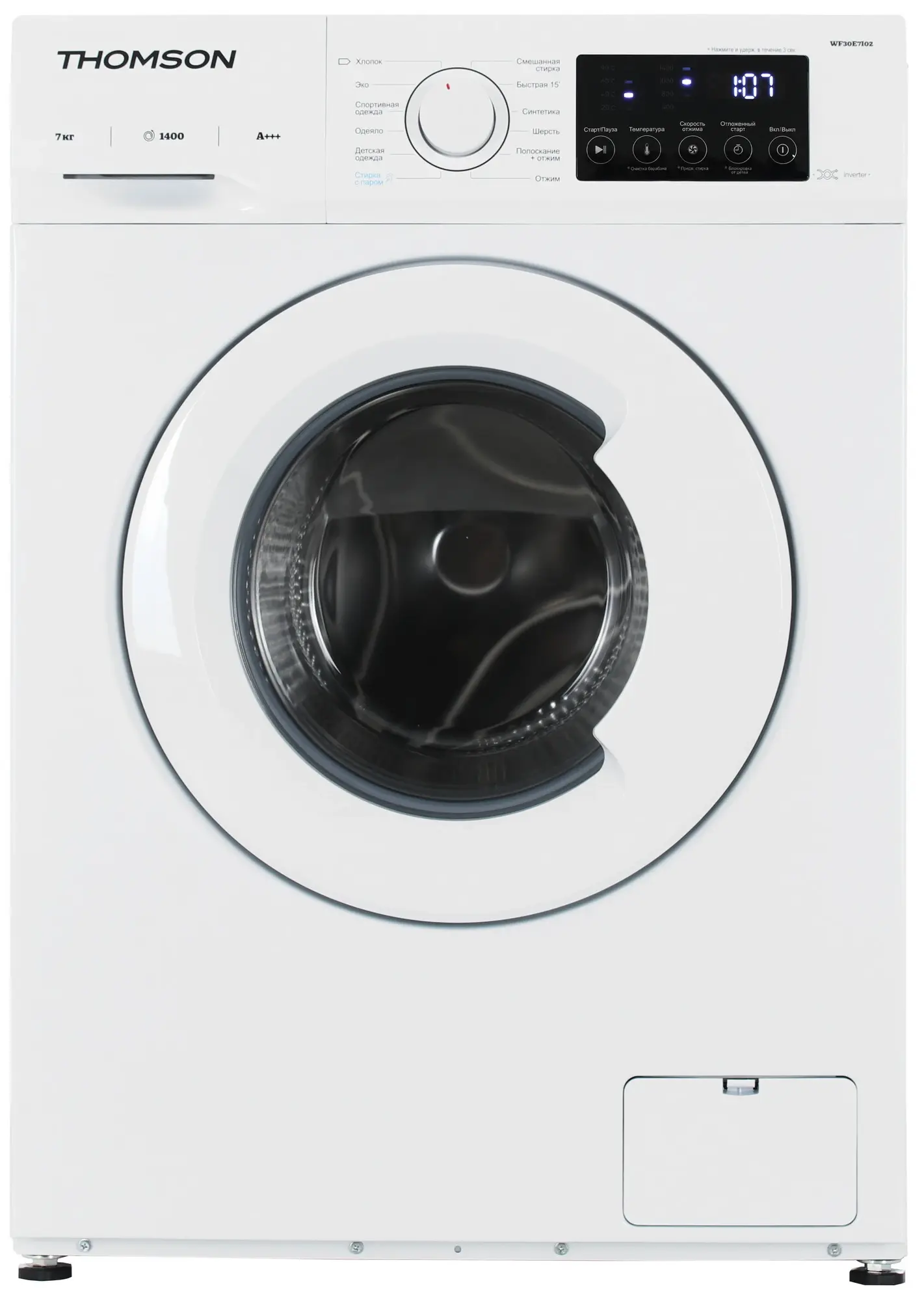 Стиральная машина THOMSON WF30E7I02 — это разумное сочетание функциональности, экономичности и надежности, которое сделает процесс стирки максимально комфортным и эффективным.