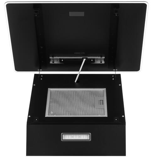 При подключении вытяжки Midea MH60AN364GB к вентиляционному отверстию она будет работать в режиме «Отвод». Загрязненный воздух будет выходить через гофрированную трубу. Если отверстия вентиляции нет, можно пользоваться прибором в режиме «Циркуляция». Для этого на входе устанавливается угольный фильтр. Воздух, загрязненный парами и запахами, проходит через него, очищается и выходит обратно в помещение. Для удобства управления используется сенсорная панель с дисплеем.