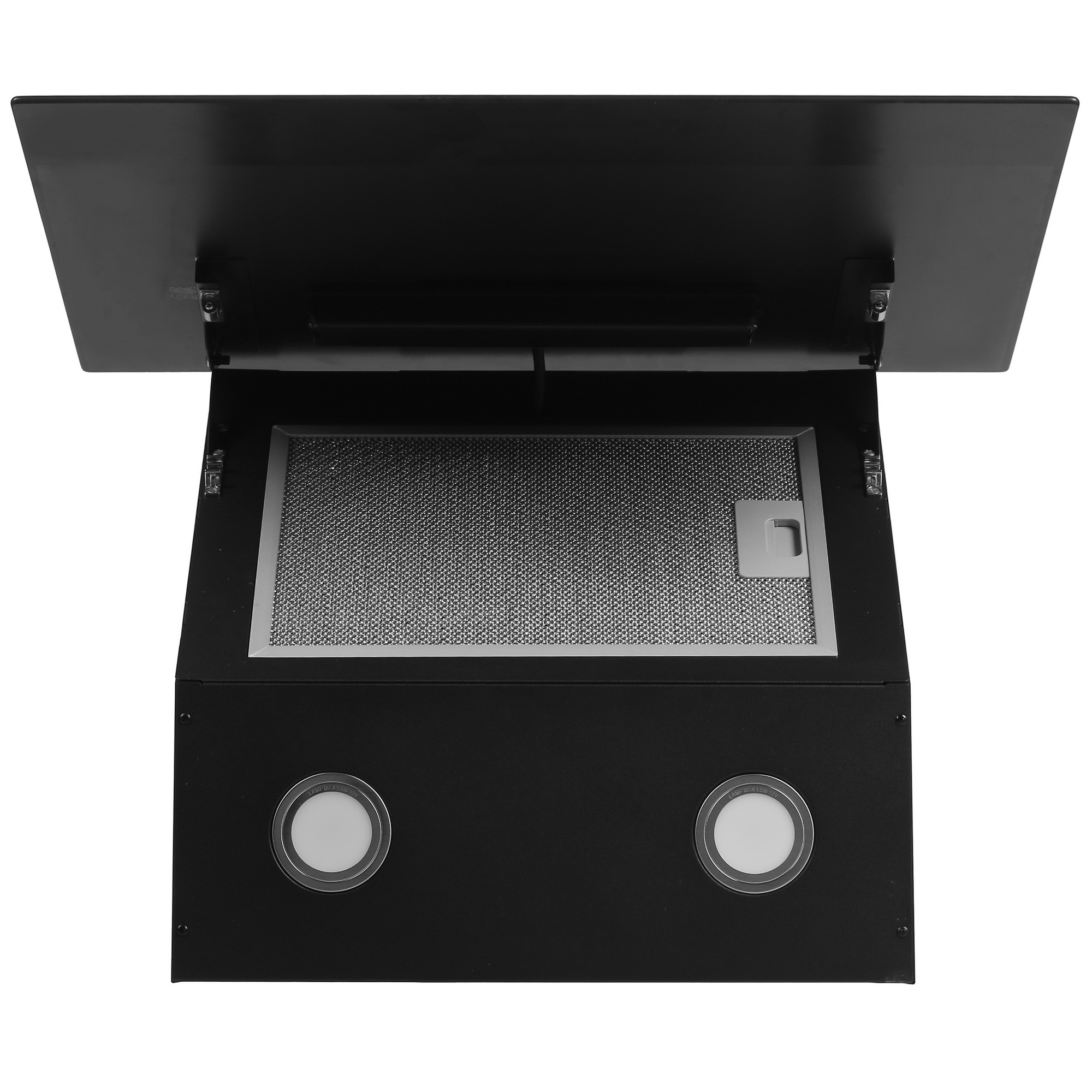 Модель оснащена двумя светодиодными лампами мощностью 1.5 Вт каждая. Они обеспечивают яркое и экономичное освещение рабочей поверхности. Антивозвратный клапан предотвращает попадание запахов из вентиляционной шахты обратно в кухню. Также имеется кабель питания с вилкой для удобного подключения.