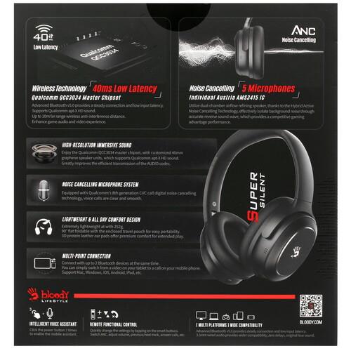 Bluetooth-гарнитура A4Tech Bloody M320 в черном цветовом оформлении отлично подойдет для геймера благодаря эффектному дизайну и высокой скорости передачи звука по беспроводному каналу. Модель подключается к ПК, ноутбуку или смартфону по беспроводному интерфейсу Bluetooth 5.0 и поддерживает связь с устройством на расстоянии до 10 м. В стереогарнитуре предусмотрены 40-миллиметровые динамики с поддержкой передачи звуков в диапазоне частот 20-20000 Гц. Амбушюры из черной экокожи гарантируют комфорт и хорошую звукоизоляцию.