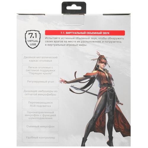 У проводной гарнитуры A4Tech Bloody G575 сдвоенное регулируемое оголовье и мягкие амбушюры из сетчатой микрофибры, что делает длительное ношение наушников комфортным. Управлять функционалом гарнитуры можно при помощи удобных кнопок и колеса прокрутки, размещенных на 2-метровом кабеле в тканевой оплетке. Подключение гарнитуры к устройствам осуществляется через USB-разъем. RGB-подсветка легко настраивается в зависимости от предпочтений пользователя, подчеркивая игровую атмосферу.