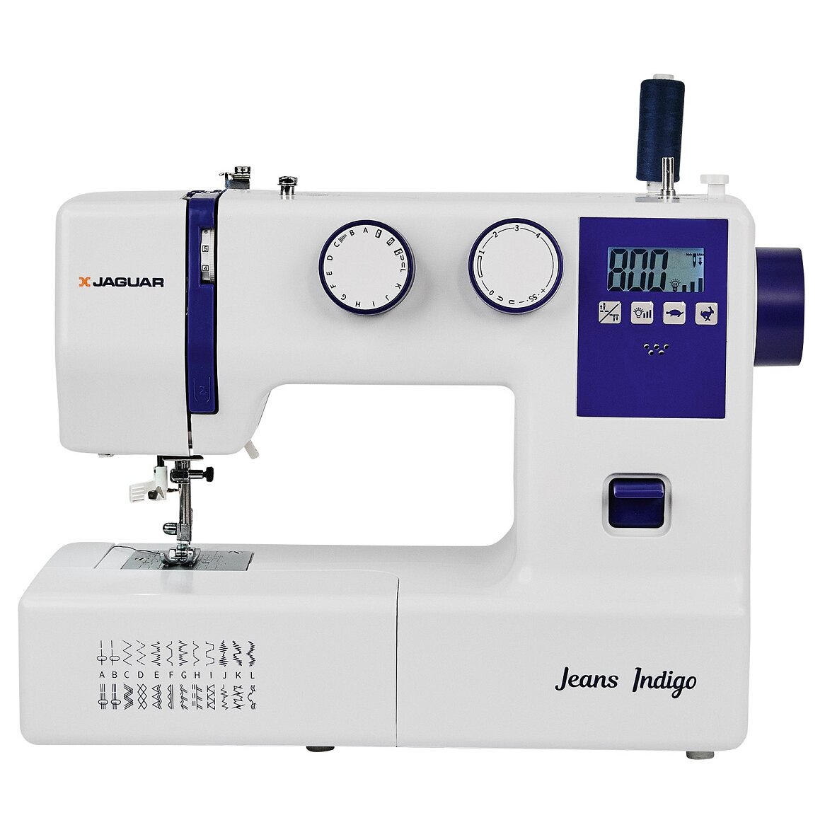 Бытовая электронная швейная машина JAGUAR Jeans Indigo со встроенным сервоприводом, вертикальным классическим челноком и ЖК дисплеем, отображающим установленные параметры функций.