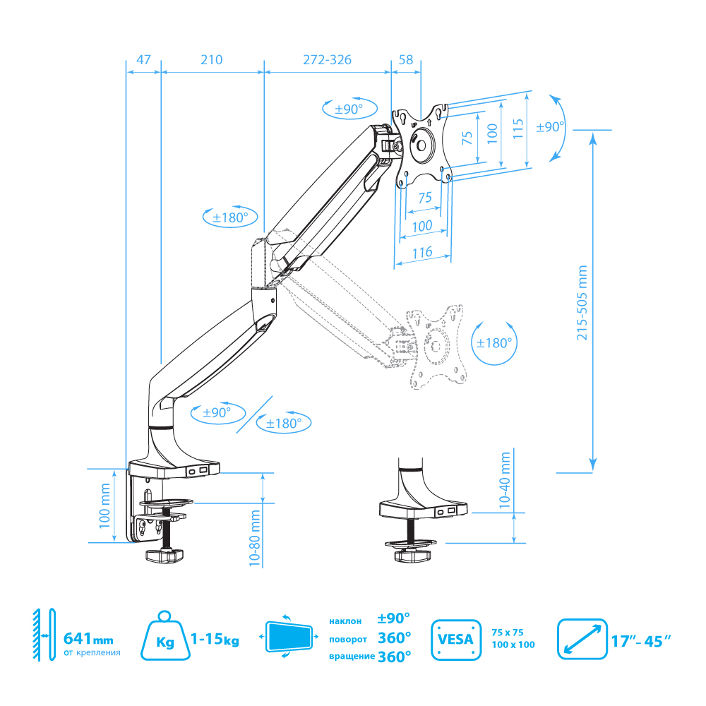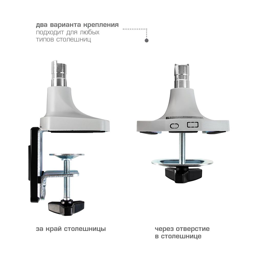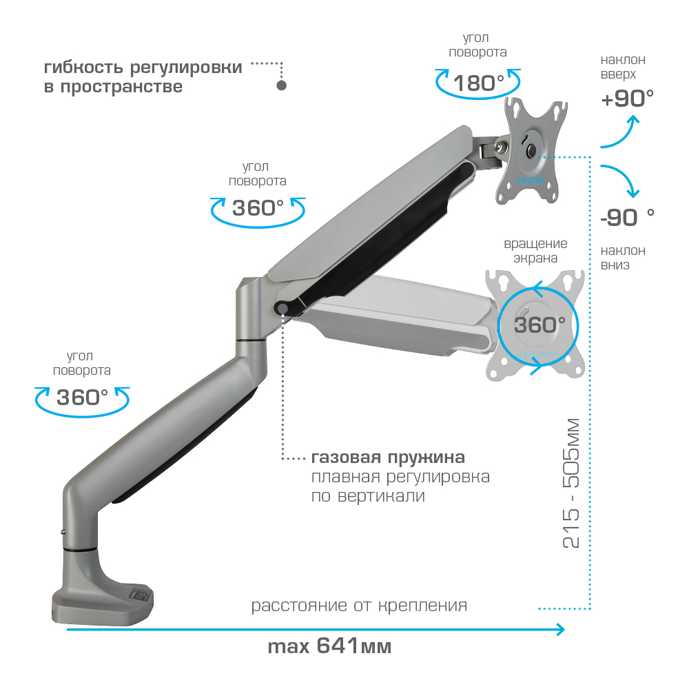 Система легкой регулировки 3D Motion System специальный сферический шарнир позволяет легко и точно регулировать положение мониторов, Вращения экрана на 360° возможность размещения мониторов, как в вертикальном, так и в горизонтальном положении, Вертикальное перемещение в пределах 270 mm, Газовая пружина GAS SPRING Обеспечивает плавное движение монитора вверх и вниз, а так же делает возможность фиксировать монитор в любом промежуточном положении, Два способа крепления к столу