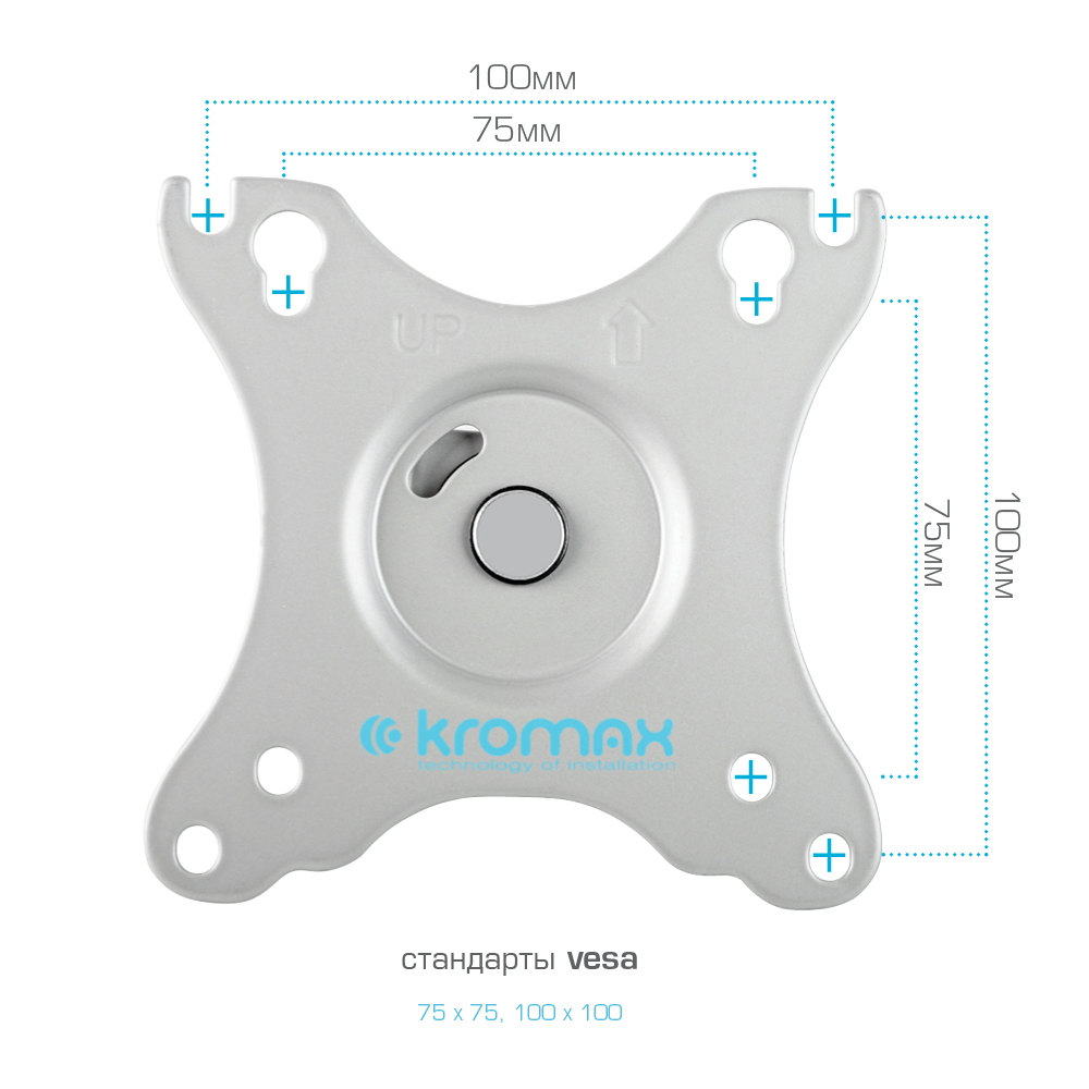 Крепёжные отверстия настольного кронштейна KROMAX OFFICE-21 SILVER изготовлены по международному стандарту VESA.