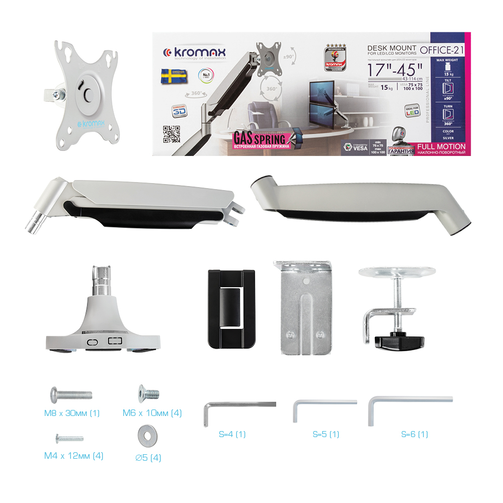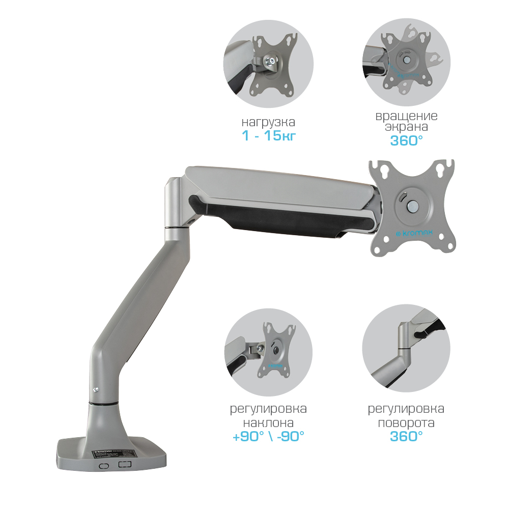 Кронштейн для крепления телевизоров и мониторов KROMAX OFFICE-21 SILVER надёжно удержит экран размером 17"-45" дюйма и весом 1-15 кг. Регулировка позволит вращать экран на 360°, наклонять вверх и вниз на ±90°, и поворачивать влево и вправо на 360° – для оптимального угла зрения и удобной посадки.