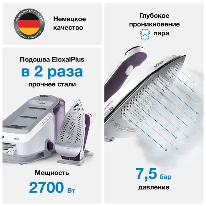 Особенности утюга, отпаривателя: Вертикальное отпаривание, Дозалив воды, Очистка от накипи, Противокапельная система, Функция самоочистки