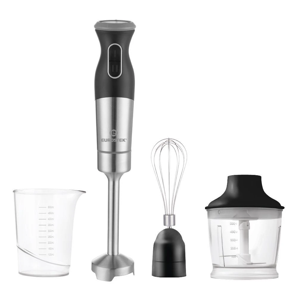 Блендер погружной EHB-1000. Мощность 1200 Вт, низкий уровень шума, 2 скорости, стальной нож, мерный стакан - 500мл, стальной венчик, измельчитель - 500мл