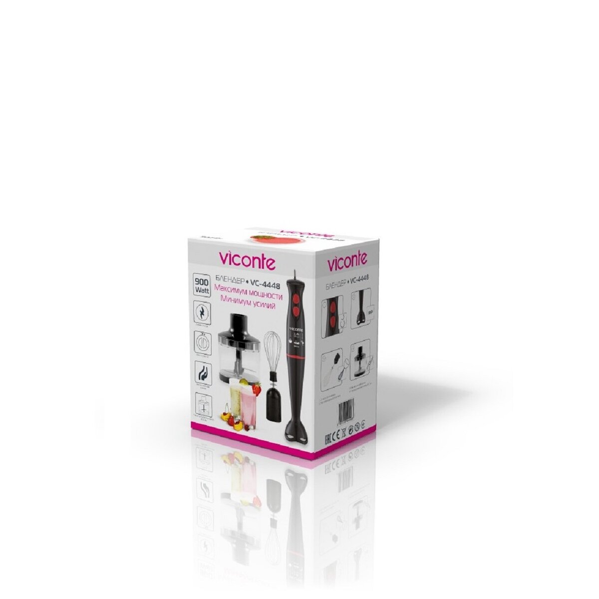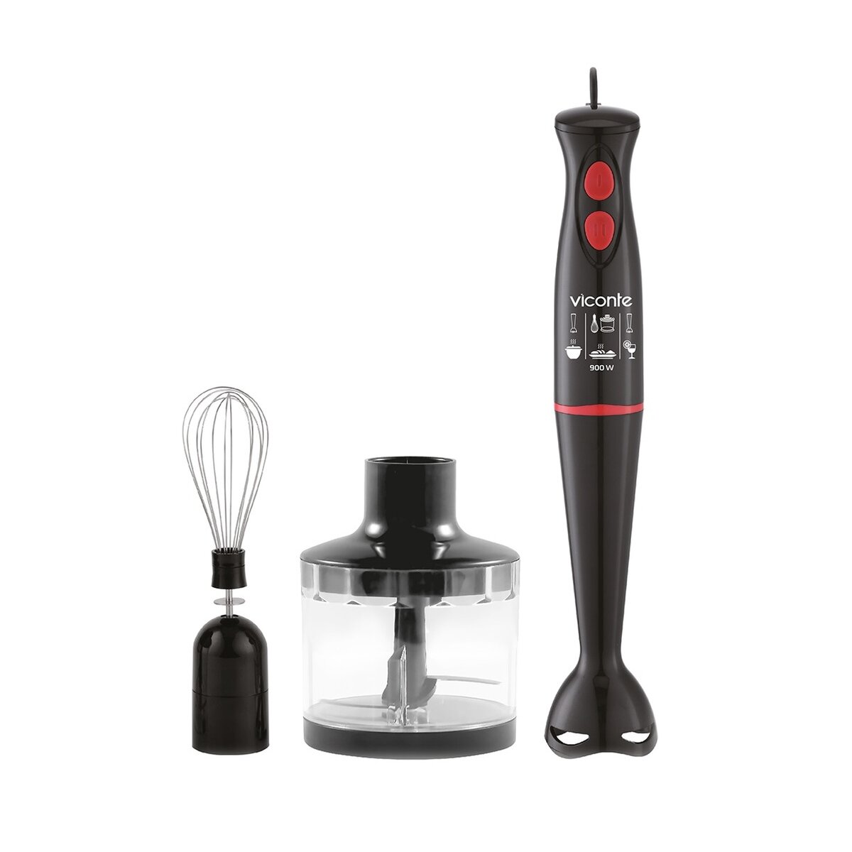 Погружной блендер Viconte VC4448 900 W, Погружной блендер, мощность 900 W, современный эргономичный дизайн, пульсовый режим работы, 2 скорости, лезвия из нержавеющей стали, пластиковая нога блендера, венчик для взбивания, чаша с ножом для рубки и измельчения, 500 мл; автоматическая блокировка при неправильно установленной насадке, удобство и простота в обращении и чистке.