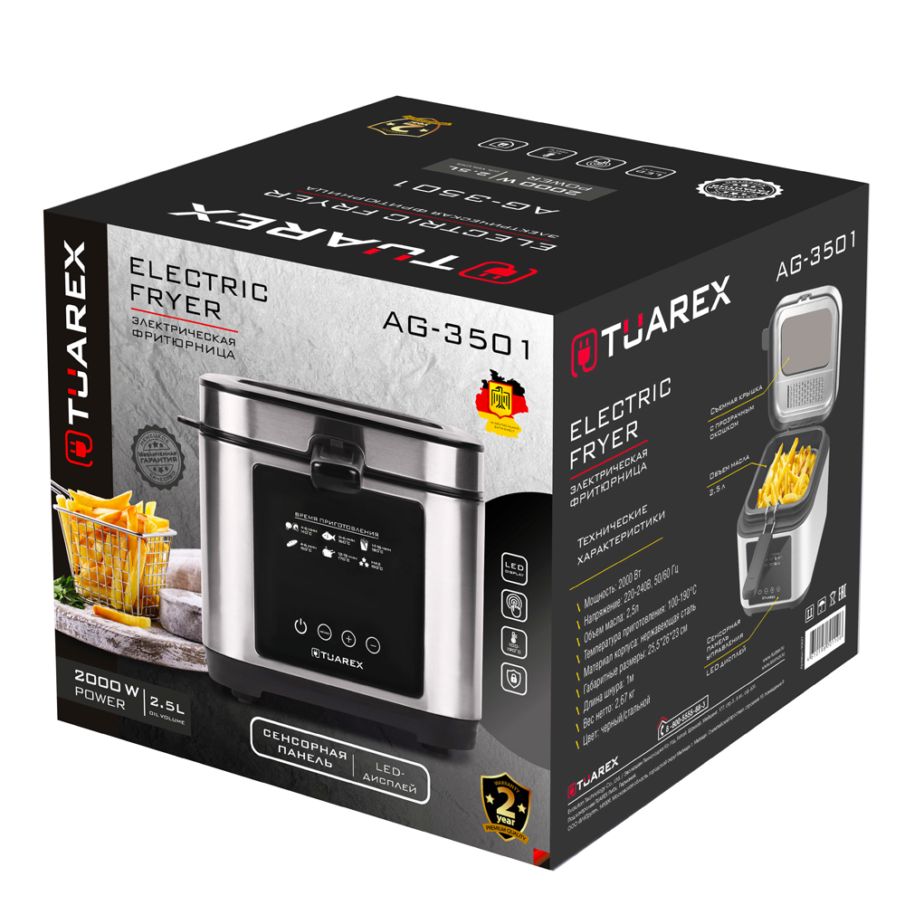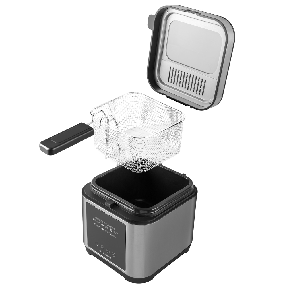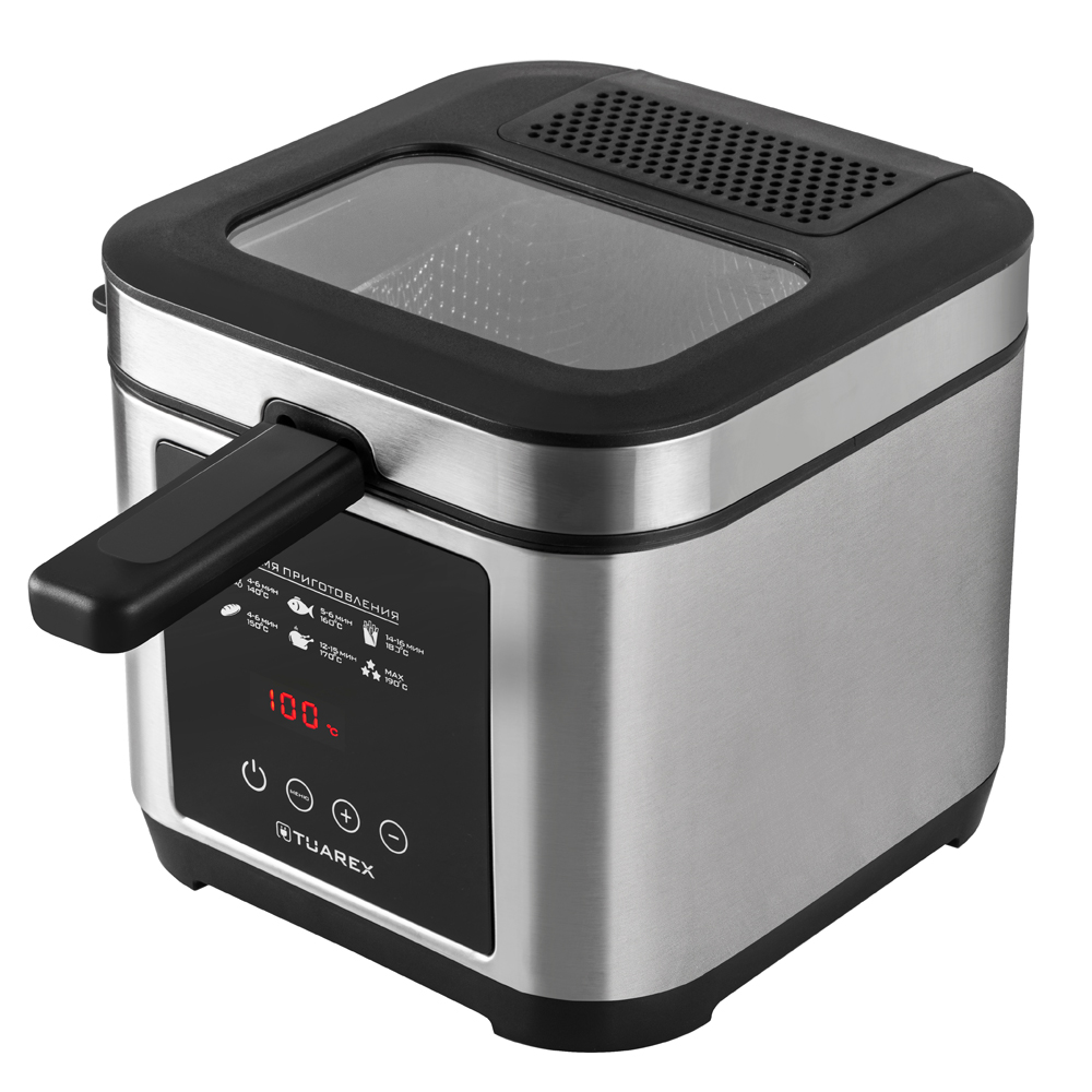Регулировка температуры приготовления, Сенсорное управление, LED дисплей, Таймер до 2 часов, Корзина для фритюра с ручкой, Антипригарное покрытие чаши, Защита от перегрева, Съемная крышка, Прозрачное окошко на крышке, Индикатор работы