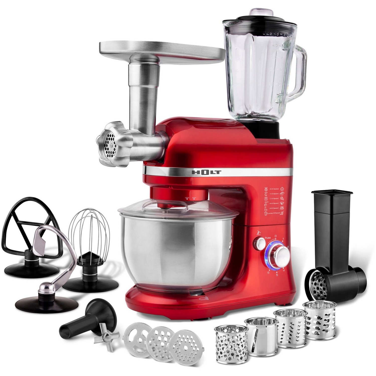 Многофункциональный кухонный комбайн 12 в 1 HOLT HT-FP-007, сочетает в себе мощный планетарный миксер, мясорубку с диском для рубленого мяса и насадкой для колбасы, овощерезку с теркой для драников и блендер с чашей из термостойкого стекла. Оснащен новым высокоэффективным ЭКО мотором, потребляющим 850 Вт при максимальной нагрузке и выдающим мощность равную 1250 Вт обычного мотора.