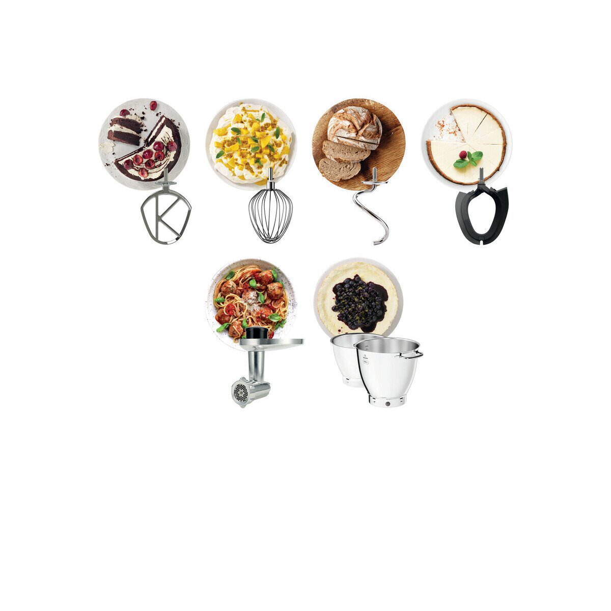 Кухонная машина; К-образный крюк; Венчик; Крюк для теста; Силиконовая насадка для мягких смесей; Чаша 7 л; Чаша 5 л; Кожух от брызг; Термостойкой шпатель; Мясорубка; Инструкция