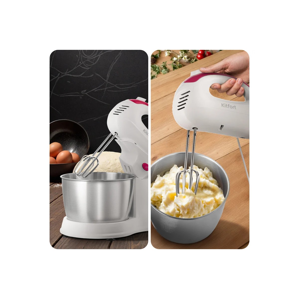 В комплекте с устройством поставляются два вида насадок: венчики подходят для взбивания ингредиентов и замеса жидкого теста для блинов, вафель или бисквитов, а крюки — для замешивания более плотного теста, например, песочного или дрожжевого. Для снятия насадок достаточно одного нажатия на кнопку, поэтому их легко менять и мыть.