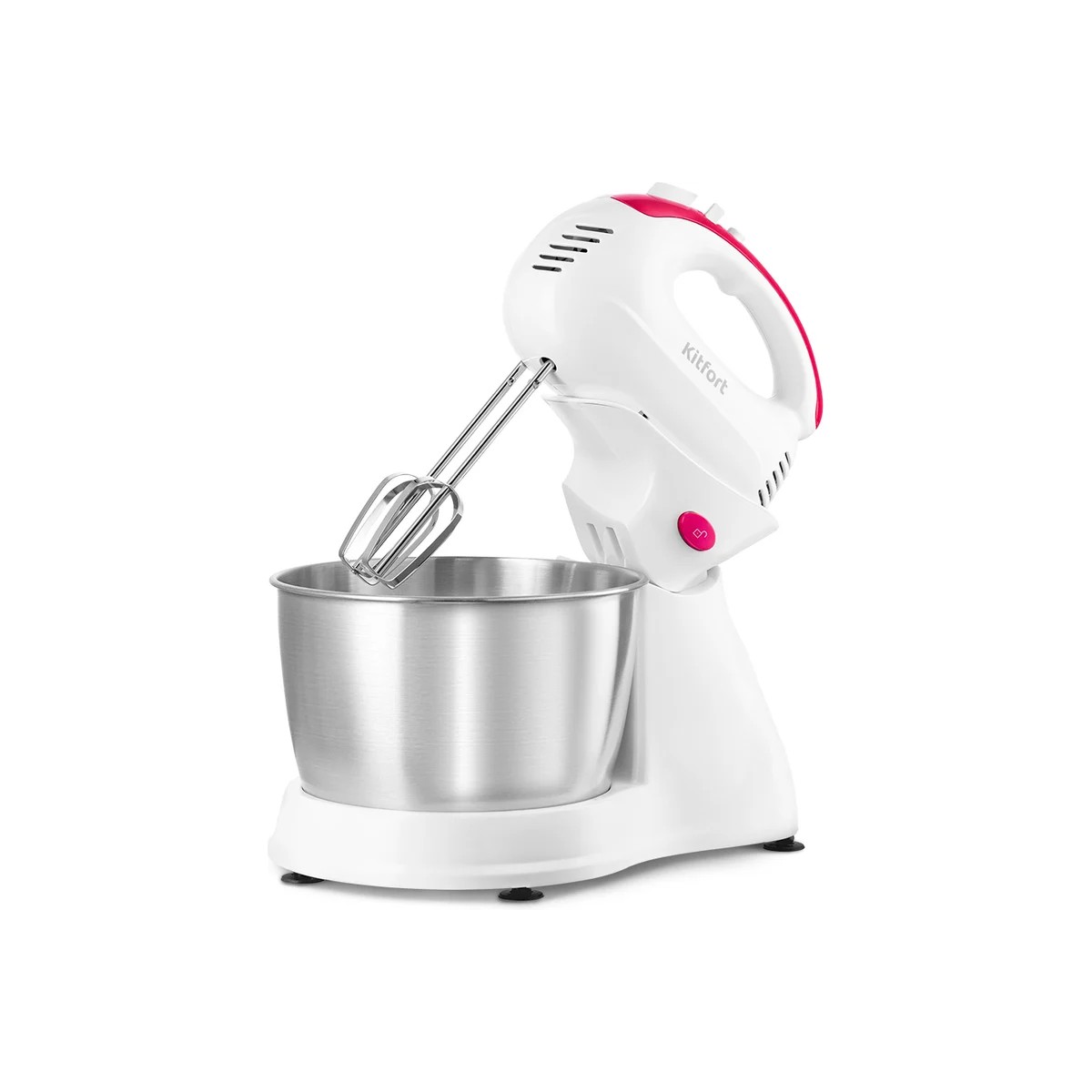 Во время работы насадки вращаются вокруг своей оси, а чашу можно вращать вручную, чтобы ингредиенты смешивались без комочков. Миксер может работать и в полностью автоматическом режиме без вращения чаши. Вам достаточно только установить насадки, положить ингредиенты в чашу и включить прибор. Это освободит вас от участия в процессе взбивания и перемешивания, а также позволит добавлять ингредиенты в чашу прямо в процессе смешивания. При этом КТ-3485 легко превращается в обычный ручной миксер, если снять его с подставки.