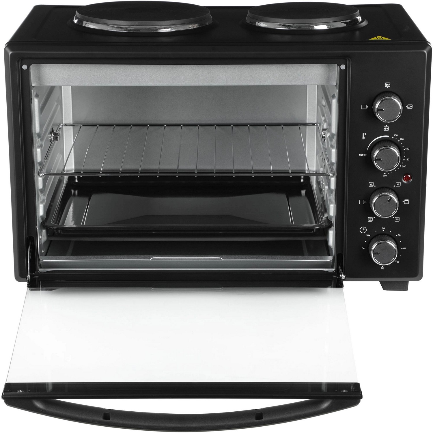 две конфорки 1000 Вт и 600 Вт, печь две конфорки 1000 Вт и 600 Вт, печь может работать одновременно как мини-печь, используя все функции, так и конфорки. Большая ручка из нержавеющей стали.