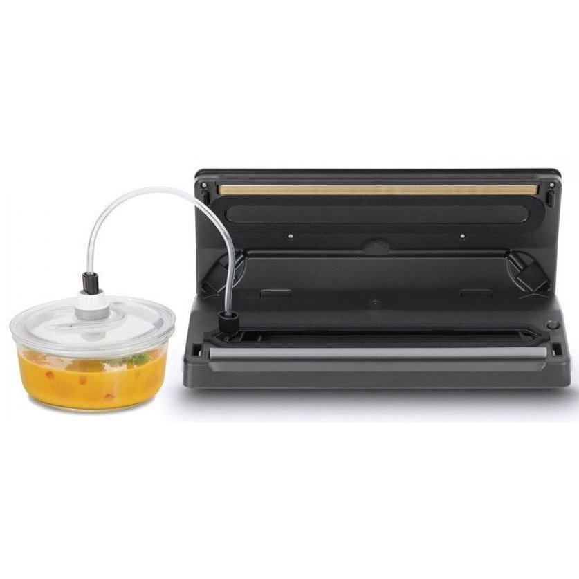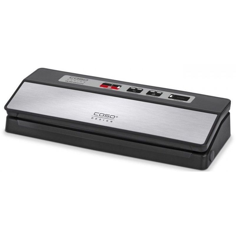 Упаковщик оборудован надежной фирменной крышкой с панелью из нержавеющей стали, электронным контролем температуры, универсальной лентой запаивания, длиной в 30 см, а также данный вакууматор обладает съемной камерой, что позволяет ее легко мыть при необходимости.