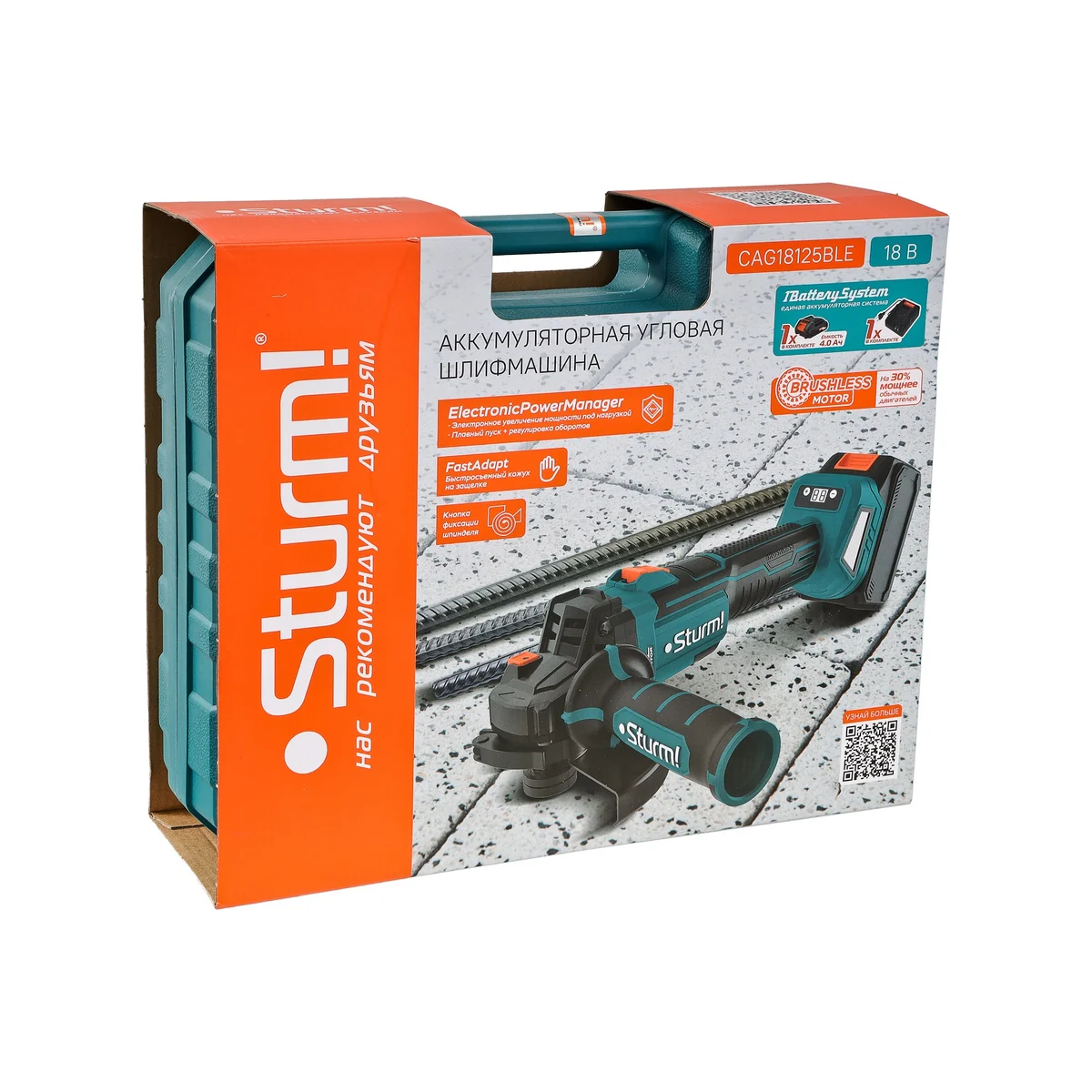 УШМ аккумуляторная CAG18125BLE Sturm! 18В является частью системы 1BatterySystem, обеспечивающей совместимость одного и того же аккумулятора с целым рядом наименований инструмента.