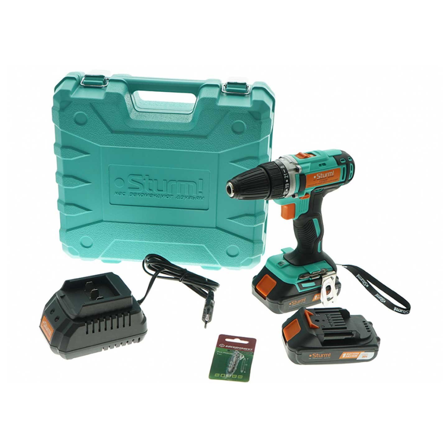 Шуруповерт, двусторонняя бита - 2 шт., зарядное устройство, аккумуляторная батарея - 2 шт., инструкция, пластиковый кейс.
