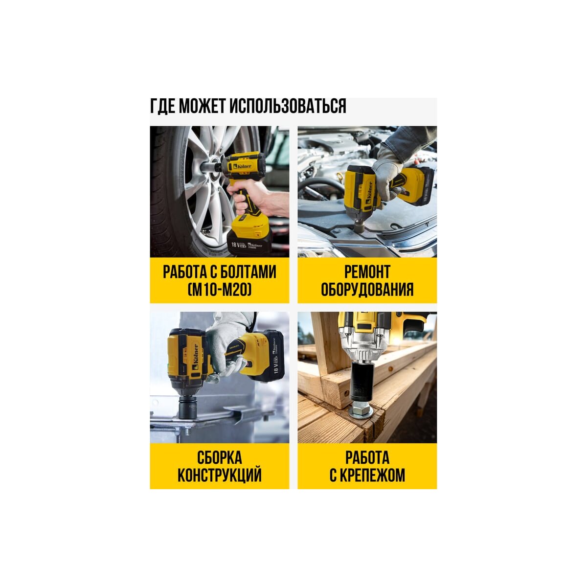 Идеально подходит для работы в автосервисах, на строительных площадках, а также для домашних задач, требующих надежного и мощного инструмента. Незаменим при монтаже и демонтаже колес, строительстве деревянных конструкций и других подобных работах.