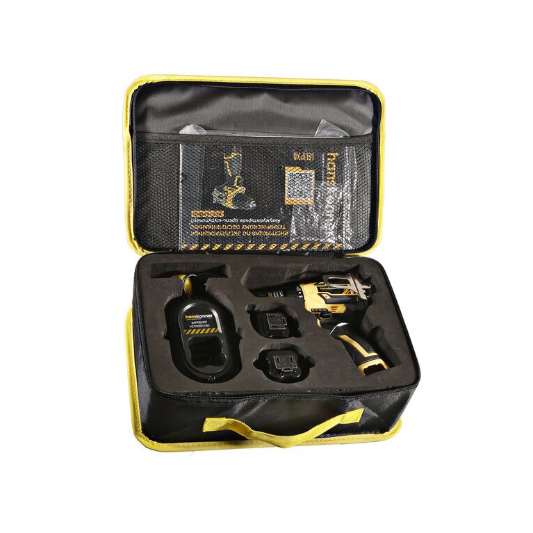 Шуруповерт поставляется с двумя сменными аккумуляторами 2.0 Ач и зарядным устройством в сумке-кейсе.
