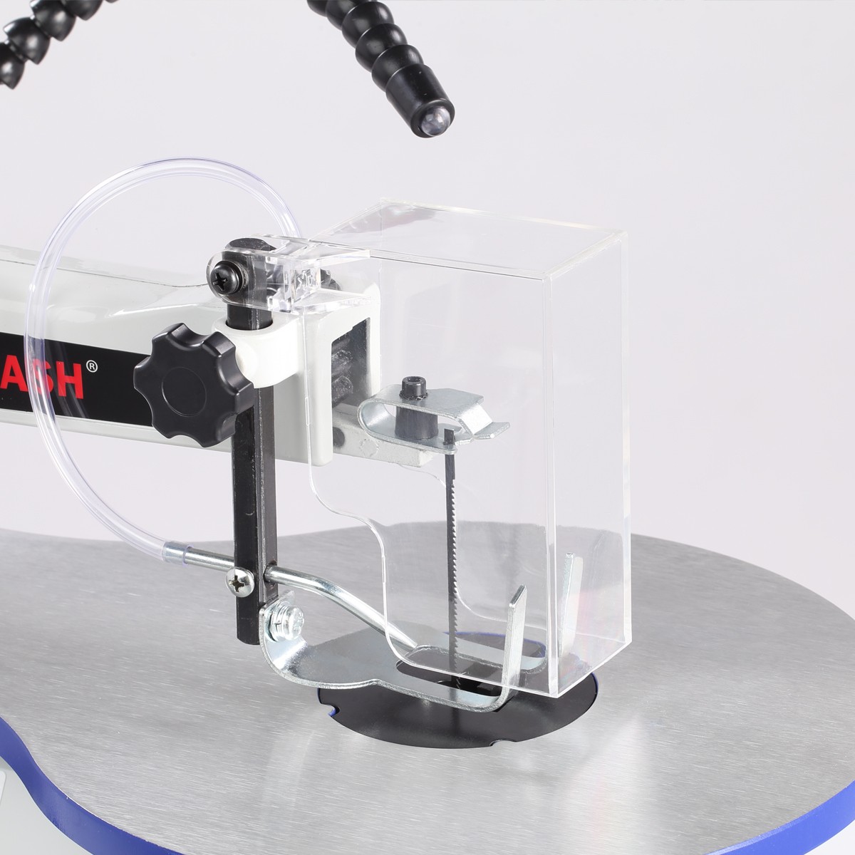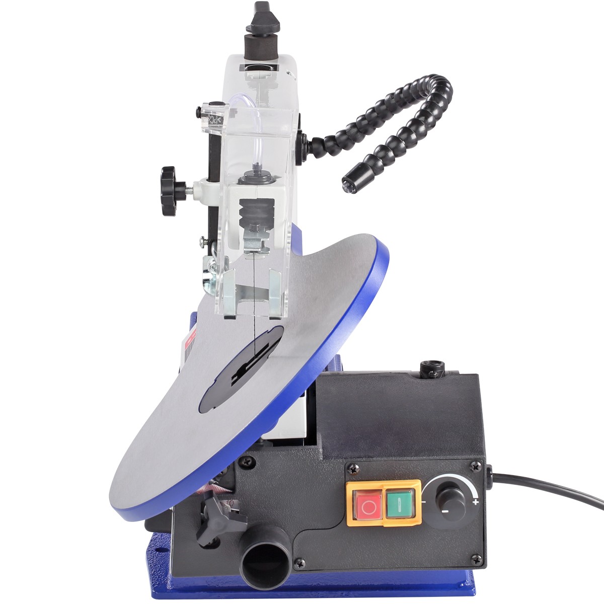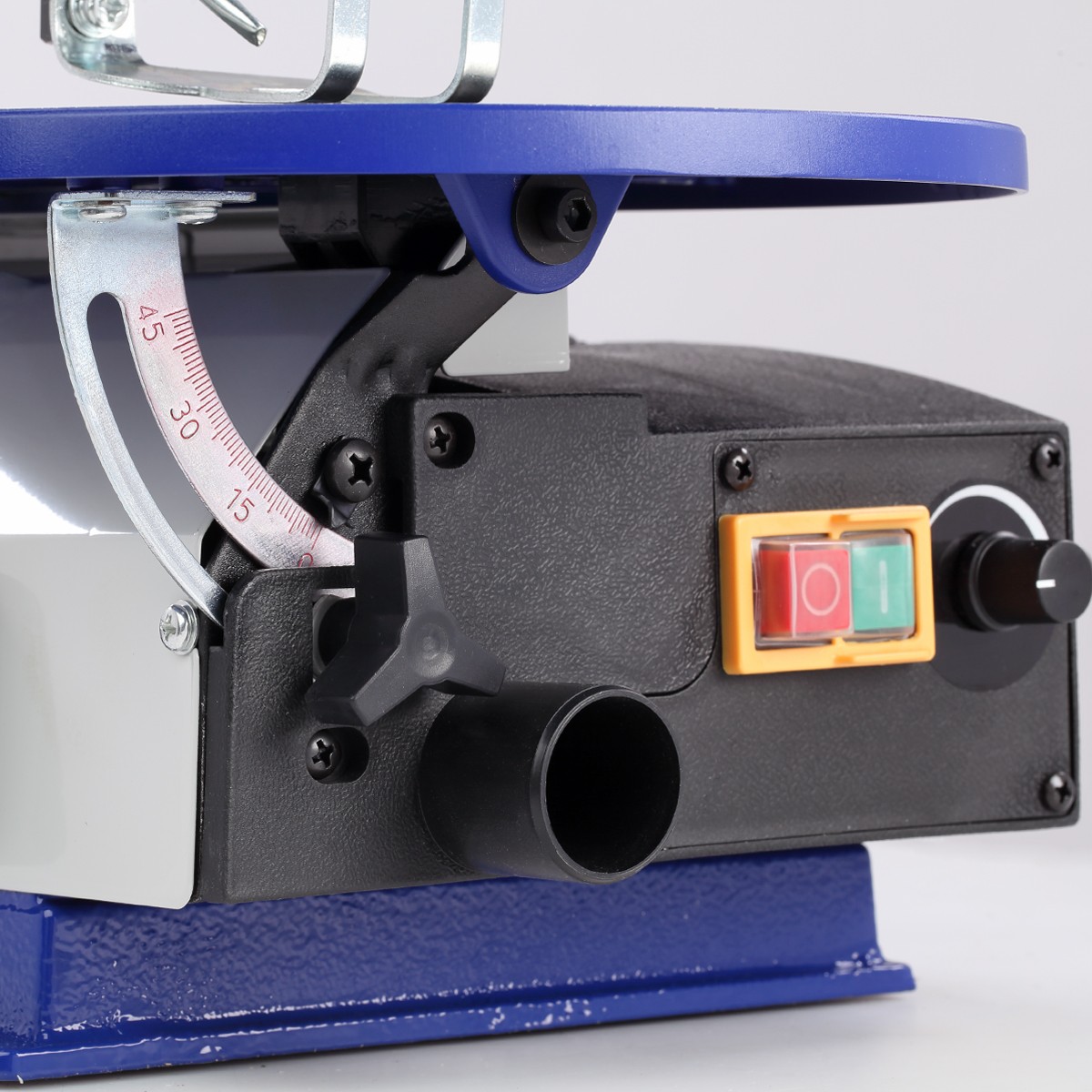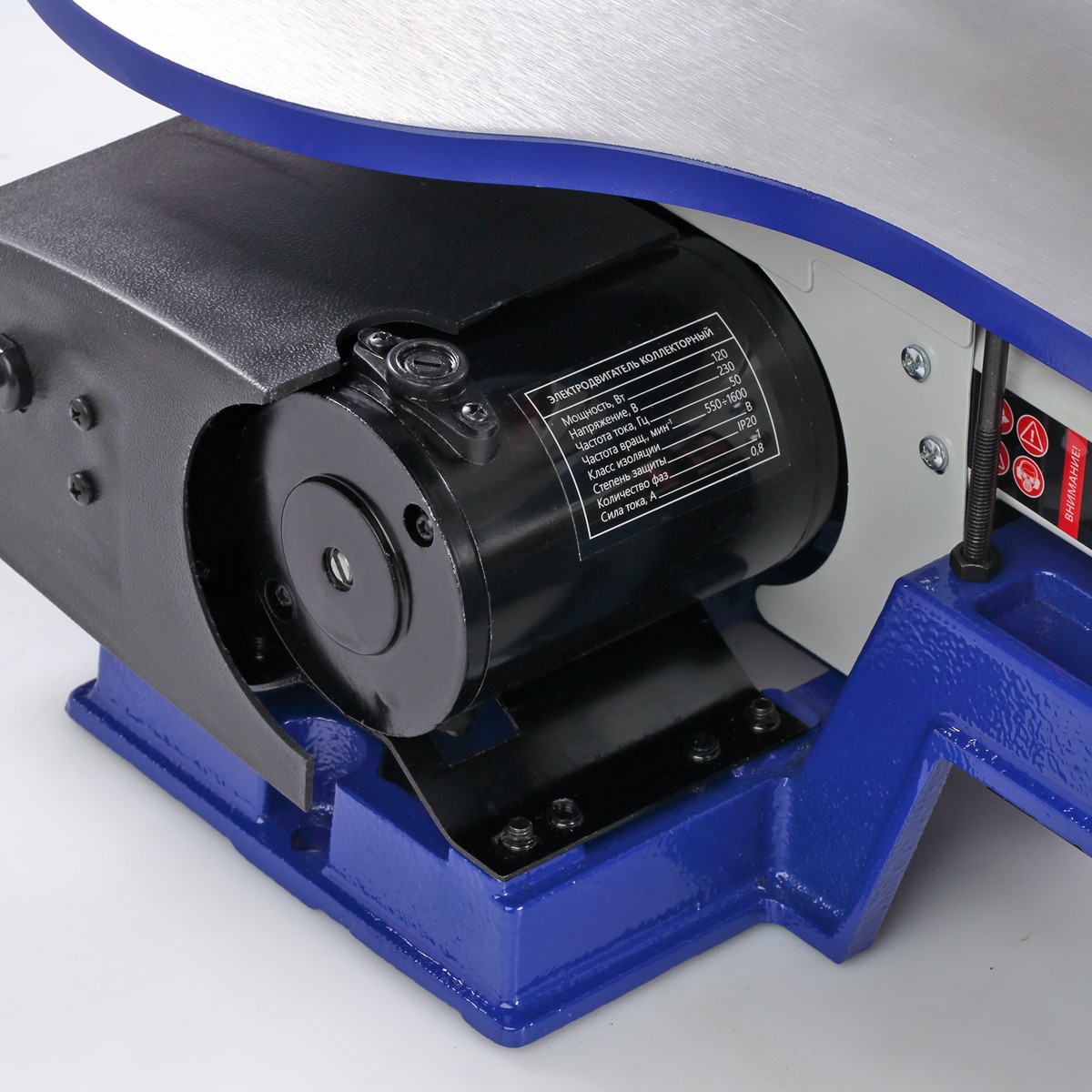 На чугунной станине установлен алюминиевый рабочий стол (253×412 мм), который имеет механизм угла наклона 0…+45 град.