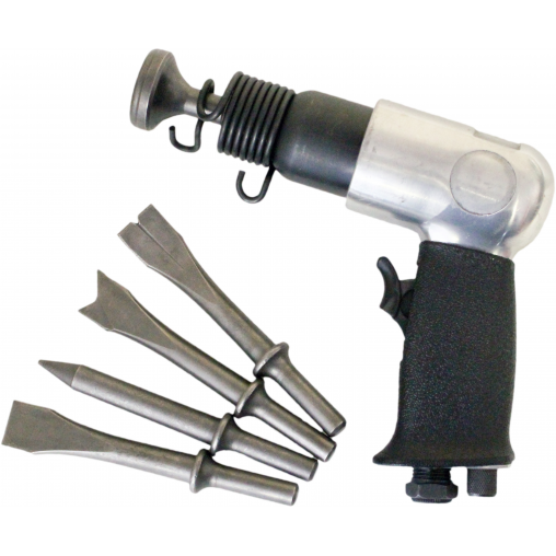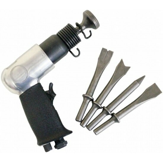 Изделие работает благодаря компрессору, который через шланг подает сжатый воздух в инструмент и приводит в действие ударный механизм.