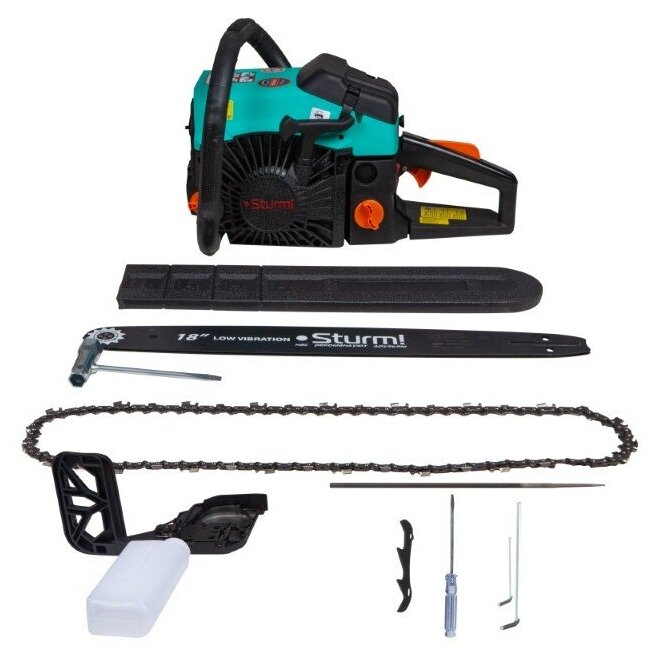 пильная цепь - 1 шт., пильная шина – 1 шт., пластиковый защитный кожух для шины - 1 шт., отвертка - 1 шт., круглый напильник для заточки цепи - 1 шт., мерный стакан для приготовления топливной смеси - 1 шт., комбинированный ключ – 1 шт., шестигранные ключи – 2 шт. (3 мм, 4 мм), зубчатый упор – 1 шт