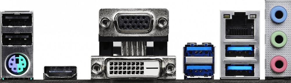 Разъёмы на задней панели : PS/2, 2 x USB 2.0, 4 x USB 3.2 Gen1, VGA, DVI, HDMI, RJ-45