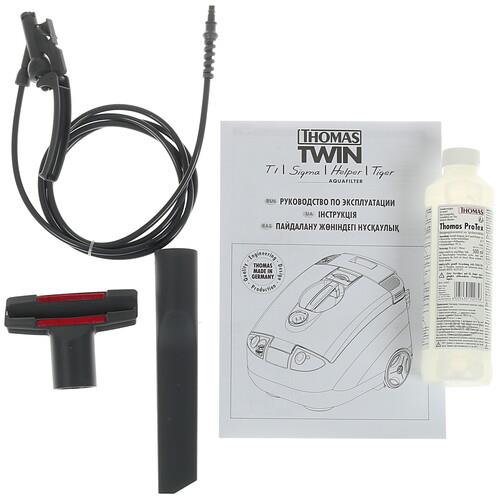 Для большой капитальной уборки у Thomas Twin Tiger есть контейнер с аквафильтром и 4 дополнительных фильтра (пористый, мокрый, фильтр тонкой очистки и микрофильтр на выходе), съемная емкость для собранной воды (4 л), контейнер (2.4 л) для моющего раствора, а также насадки для телескопической всасывающей трубы. Мощность всасывания пылесоса – 300 Вт, мощность потребления равна 1600 Вт.