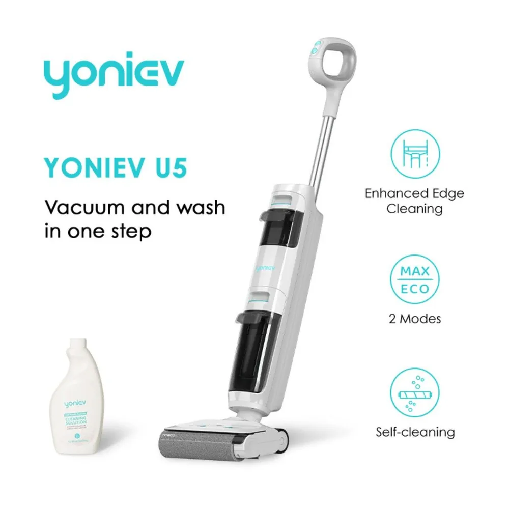 Yoniev пылесос Wet & Dry U5 – беспроводная модель. Она предназначена для единовременного выполнения двух типов уборки — сухой и влажной. Щетка примыкает к стене с одной стороны, позволяя проводить очистку вдоль плинтусов. Устройство удаляет пятна любой стойкости. Щетку можно наклонять на 30°. Это удобно для очищение полов и удаления пыли под мебелью. можно собрать пыль, скопившуюся под мебелью. Благодаря разделению потоков и двум герметичным емкостям для жидкости для влажной уборки используется только чистая вода. Детали устройства можно промывать под водой.