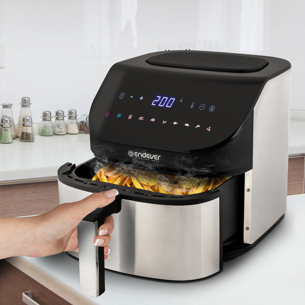 10 автоматических программ, LED дисплей, Контейнер с антипригарным покрытием, Таймер до 480 минут, Большой объем чаши на 7 литров, Сенсорная панель управления, Функция размораживания, Функция сушки овощей и фруктов, Регулировка времени и температуры приготовления , Обжаривание продуктов циркулирующим горячим воздухом без использования масла, Равномерная конвекция для лучшей прожарки, Автоматическое отключение, Защита от перегрева