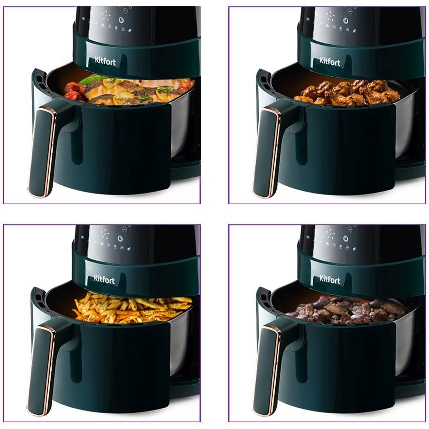Современный аэрогриль Kitfort КТ-2222 может использоваться как аэрогриль, а также как аэрофритюрница и духовка и позволяет готовить большинство продуктов с минимальным количеством масла или вовсе без его добавления.