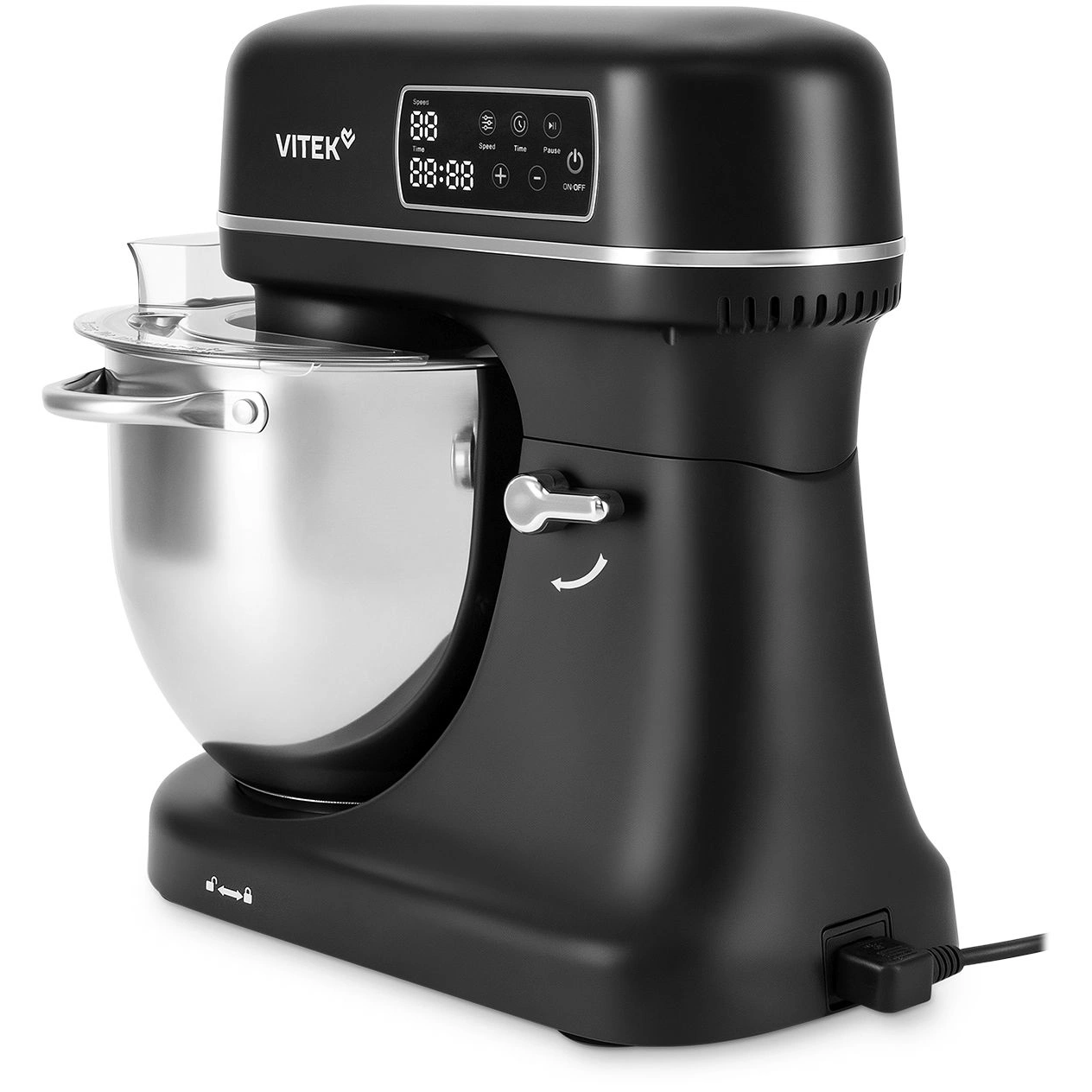 Миксер, чаша, защитный обод, насадка-венчик, насадка-крюк, насадка-лопатка, кулинарная силиконовая лопатка, книга рецептов, инструкция