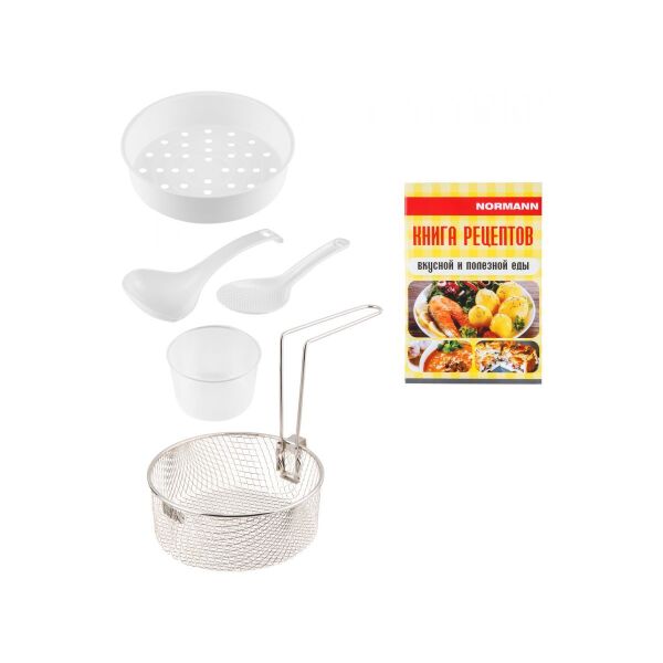 Книга рецептов, Мерный стакан, Контейнер-пароварка, Ложка для риса, Ложка для супа, Корзина для жарки во фритюре
